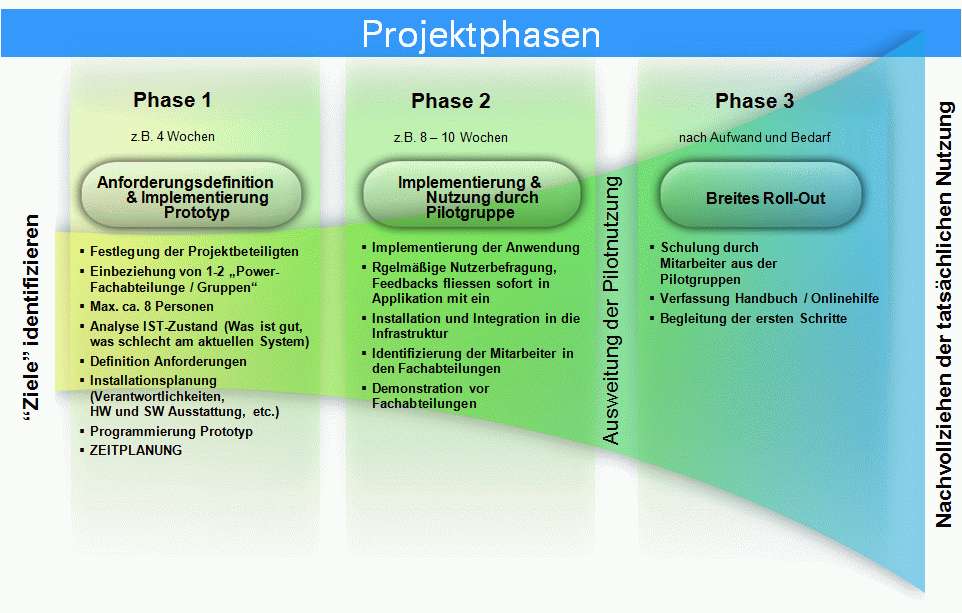 In der Regel gehen wir in den Projekten mit Ihnen nach folgenden 3 Phasen vor